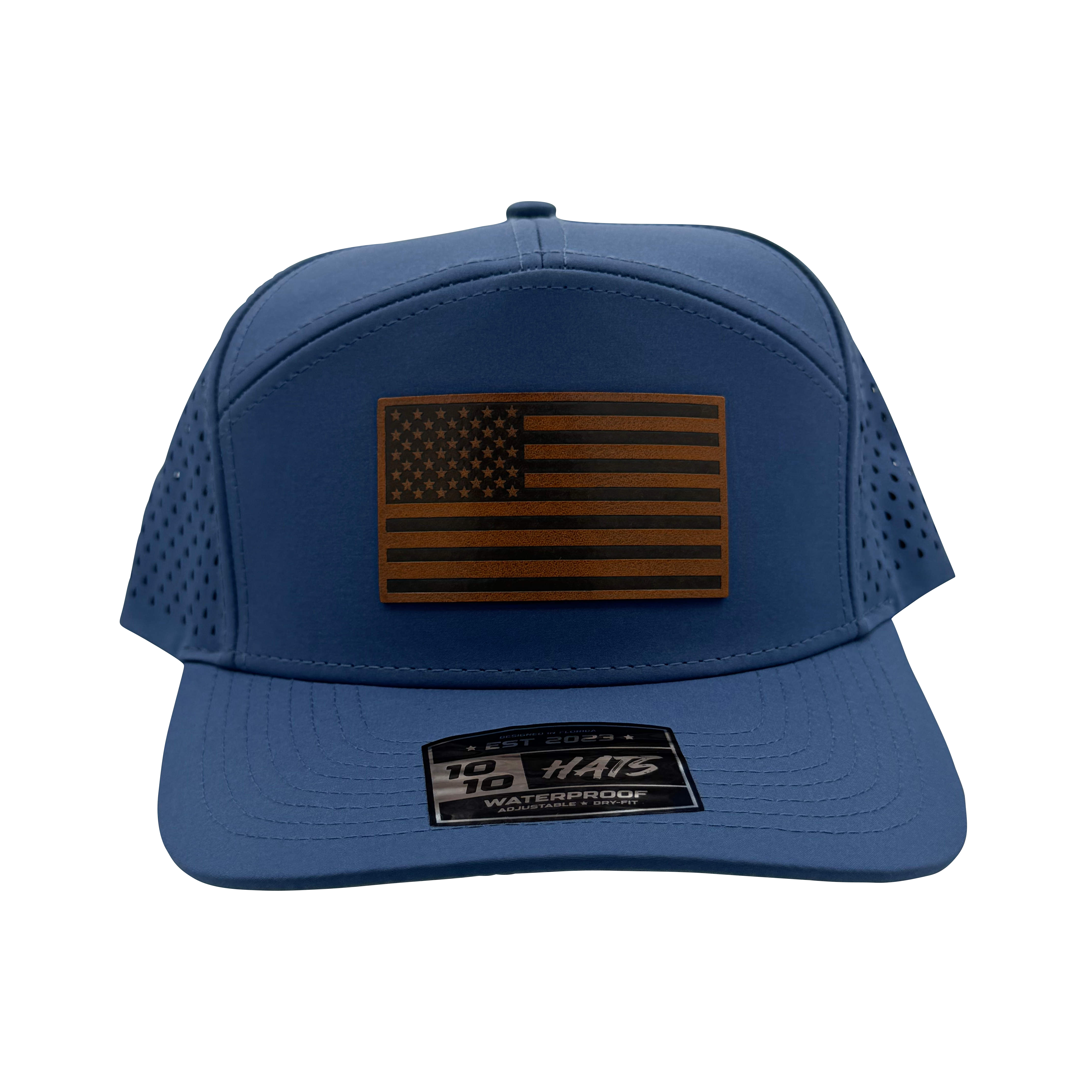 Deep Blue 7 Panel Hat with American Flag Leather Patch Stand out with the Deep Blue 7...