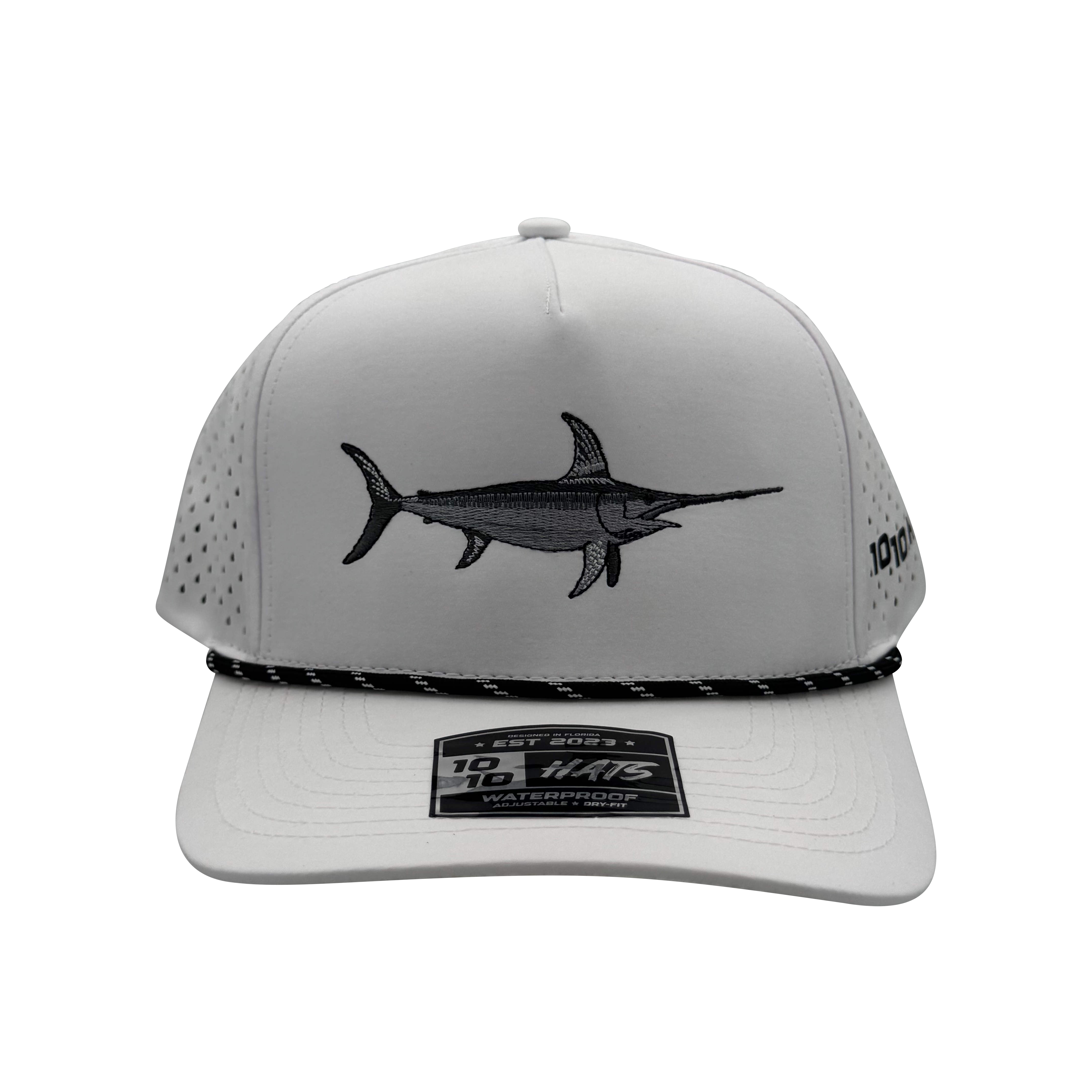 White 5-Panel Rope Hat with SwordfishA clean and crisp white rope hat featuring a bold swordfish patch...
